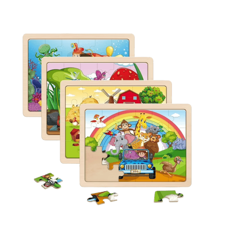 This Wooden Puzzle Set helps children build patience and cognitive skills as they complete colorful, easy-to-handle puzzle pieces.